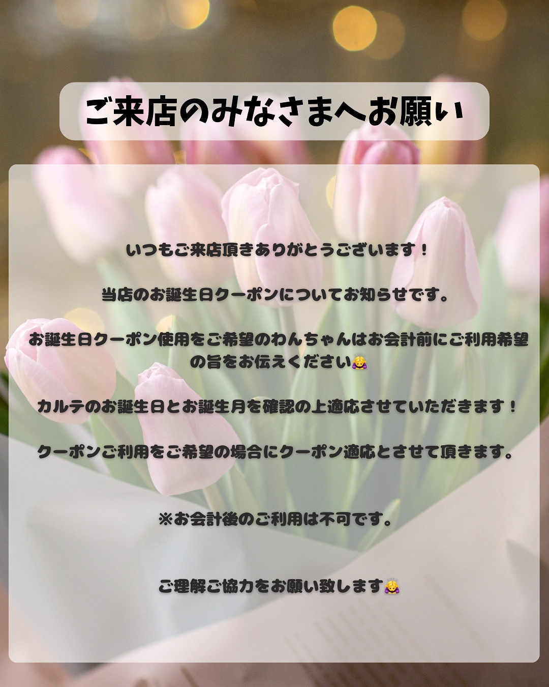 お誕生日クーポンについてですが、ご利用をご希望のお客様はお会計前にご利用のご希望の旨お伝えください🙇♀️